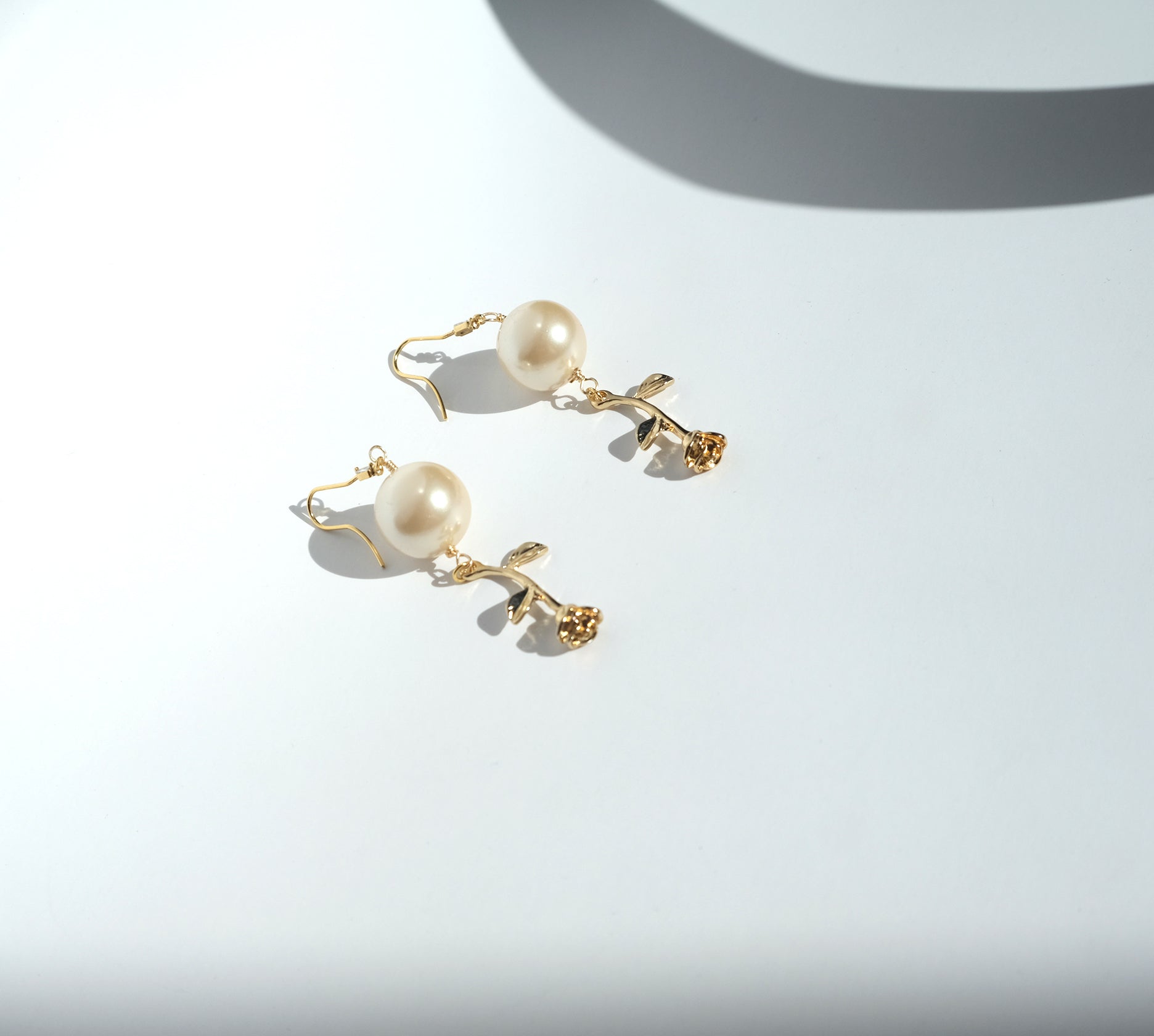 Softly luminous pearls a delicate rose motif. A timeless design that balances femininity and quite elegance.